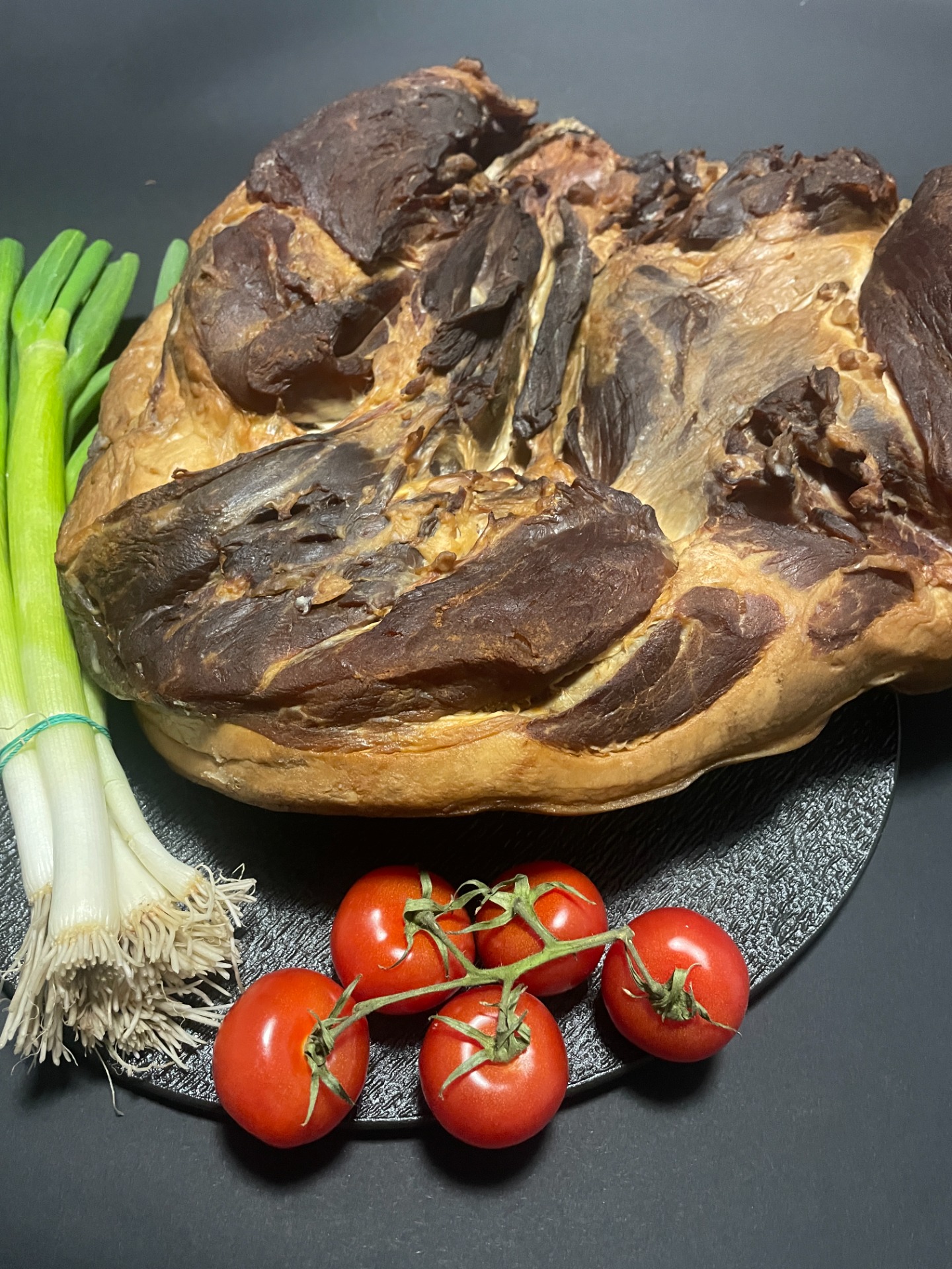 Saját gazdaságban gondosan nevelt sertésből,hagyományos eljárással,bükkfán füstölt combsonka, csont nélkül. Egy darab kb.: 5kg.
